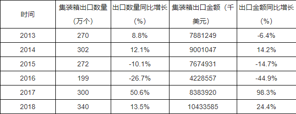 2013—2018年中国集装箱出口数量及出口金额统计表